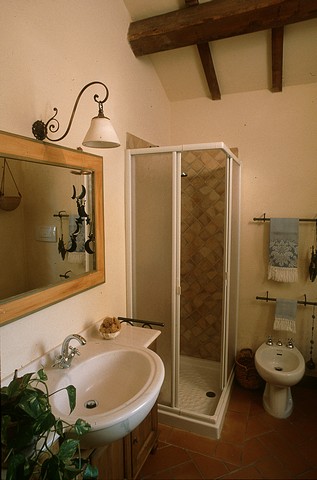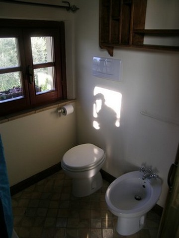 Im Obergeschoss des Ferienhauses befindet sich ein großes Schlafzimmer mit einem Doppelbett und einem angrenzendem Badezimmer mit Dusche, WC und Bidet. Vom Schlafzimmer gelangt man auf eine große Terrasse mit fantastischem Ausblick bis zu den Monti Sibillini Bergen.