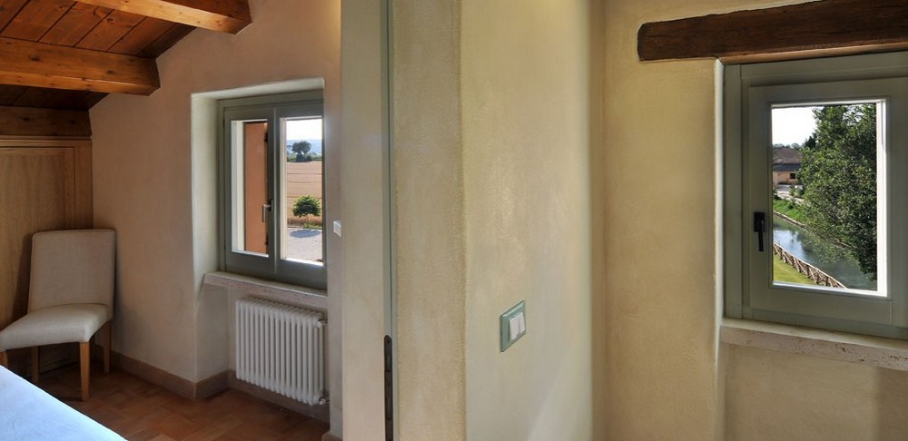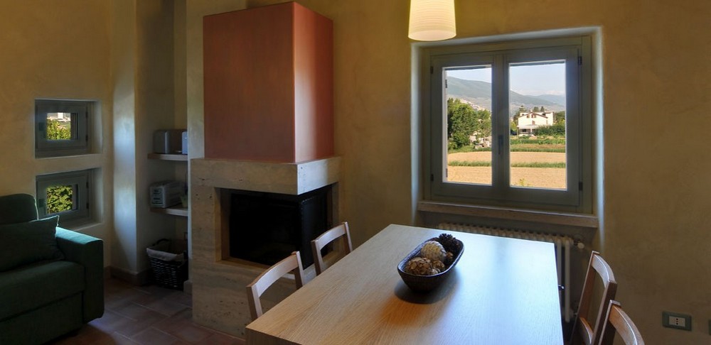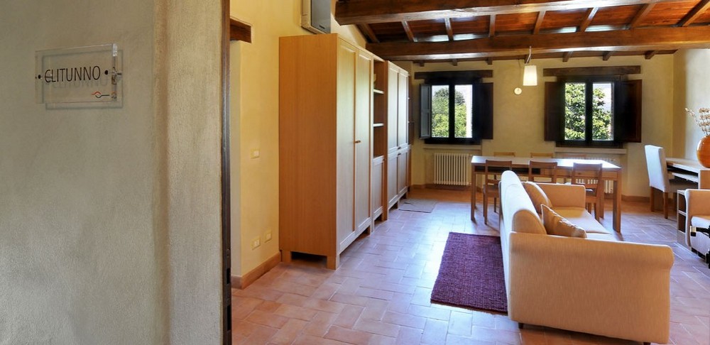 Die drei Zimmer Wohnung befindet sich im Zwischengeschoss des Anwesens aus dem frühen achtzehnten Jahrhundert. Alle drei Zimmer bieten einen grandiosen Ausblick auf den Fluss Clitunno, dessen langsame Strömung dem Ort eine magische Atmosphäre verleiht, die beruhigend und entspannend wirkt. Der Fluss Clitunno entspringt ca. 8 Kilometer stromaufwärts vom Landhaus entfernt. Das großzügige Wohnzimmer ist mit Kamin und zwei Schlafsofas ausgestattet. Hier stehen dem Gast auch die Küchenzeile sowie Esstisch und Stühle zur Verfügung. Vom Wohnzimmer gehen zwei Türen in die jeweiligen Schlafbereiche mit angrenzenden Bädern. Eines der Badezimmer verfügt über eine Whirlwanne, das andere Bad verfügt über eine Spa Dusche. Das Appartement verfügt über eine individuell einstellbare Klimaanlage.