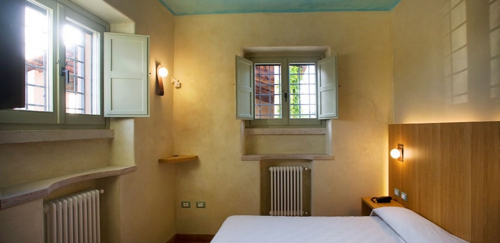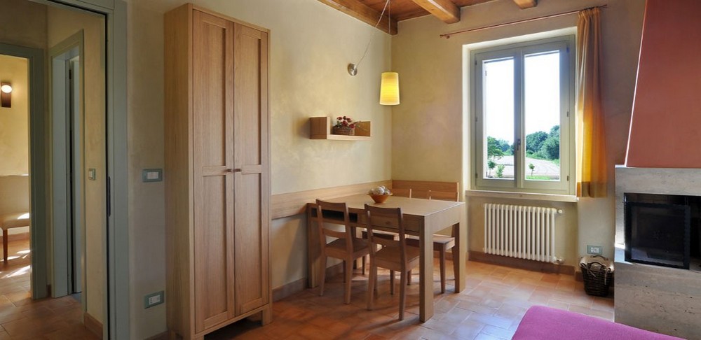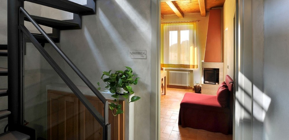 Gemütliches zwei Zimmer Appartement im ersten Stock. Das Appartement besteht aus einem Schlafzimmer mit Doppelbett, einem Badezimmer mit Dusche sowie einem Wohn/Esszimmer mit Kamin und einer kleinen Küchenzeile, ausgestattet wie im Appartment le Coste beschrieben. Die Ausziehcouch bietet einer weiteren Person Platz. Das Appartement wurde nach dem Architekten Carlo Maderno benannt, einem Spezialisten wasserbaulicher Maßnahmen Ende des 15. Jahrhunderts; das Appartement Maderno trumpft mit einem malerischen Blick auf den Fluss Clitunno. Das Appartement verfügt über eine individuell einstellbare Klimaanlage.