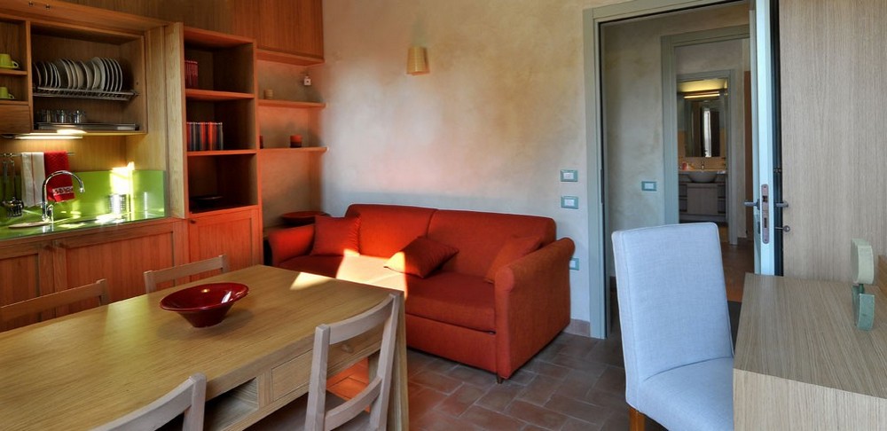 Das großzügige zwei Zimmer Appartement bietet bis zu 4 Personen ausreichend Platz und trumpft mit einer sagenhaften Panoramaaussicht auf die umliegende Naturlandschaft. Das Appartement befindet sich im zweiten und somit höchstem Stockwerk. Es verfügt über ein Schlafzimmer mit Doppelbett und einem Badezimmer mit Dusche. Von der Panorama Veranda des Appartements genießt man einen traumhaften Ausblick auf den Fluss Clitunno und gelangt von hier ins angrenzende Wohn/Esszimmer, welches von einem Kaminofen vervollständigt wird. Das gemütliche Wohn/Esszimmer ist mit einer ausziehbaren Schlafcouch (für 2 Personen) ausgestattet und verfügt ferner über einem LCD-Sat-Tv. Der Küchenschrank im Wohnzimmer besteht aus einer kleinen Kochvorrichtung (2 Induktions-Kochflammen Herd, Kühlschrank mit kleinem Gefrierfach und Spüle) und einem Holztisch mit Holz Stühlen. Das Appartement verfügt über eine individuell einstellbare Klimaanlage.