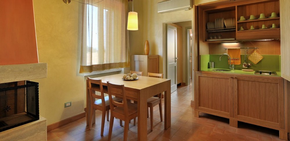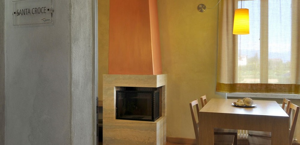 Das zwei Zimmer Appartement Santa Croce befindet sich im ersten Stockwerk und ist mit einem Schlafzimmer mit Doppelbett, einem Badezimmer mit Dusche und einemWohn/Esszimmer mit Kamin und Doppelschlafcouch ausgestattet . Im Wohn/Esszimmer befindet sich eine Küchenzeile, sowie Esstisch und Stühle (wie in Appartement Le Coste beschrieben). Das Appartement verdankt seinen Namen einem "Kreuz ", welches sich am Grundstücksende des Landhauses und der Straße, die zum Dorf führt, befindet. Es wurde Anfang des 9. Jahrhunderts errichtet und noch heute findet einmal jährlich (im Mai) eine Prozession zu Ehren der Heiligen Madonna di Lourdes statt. Das Appartement verfügt über eine individuell einstellbare Klimaanlage.