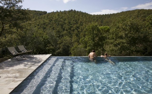 Ein weiteres Highlight ist die Terrasse und der moderne Pool im Garten des charmanten Landhaushotels, der einen fantastischen Blick ins Tal freigibt.