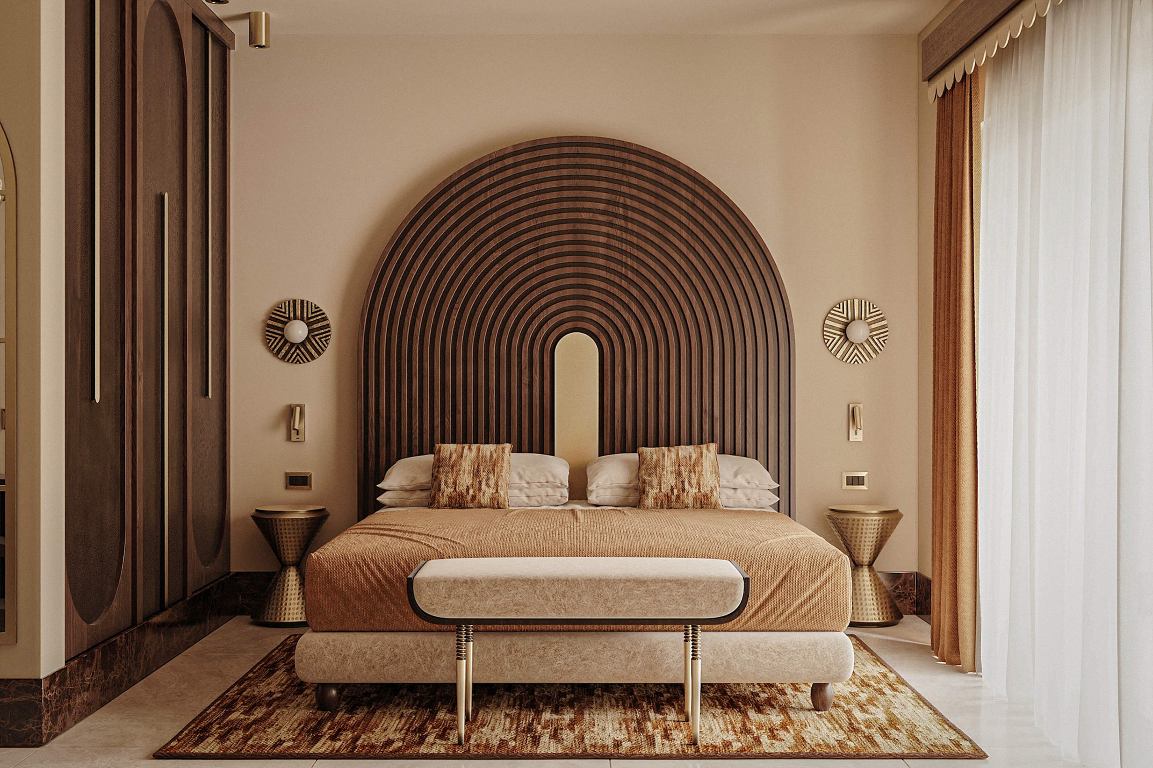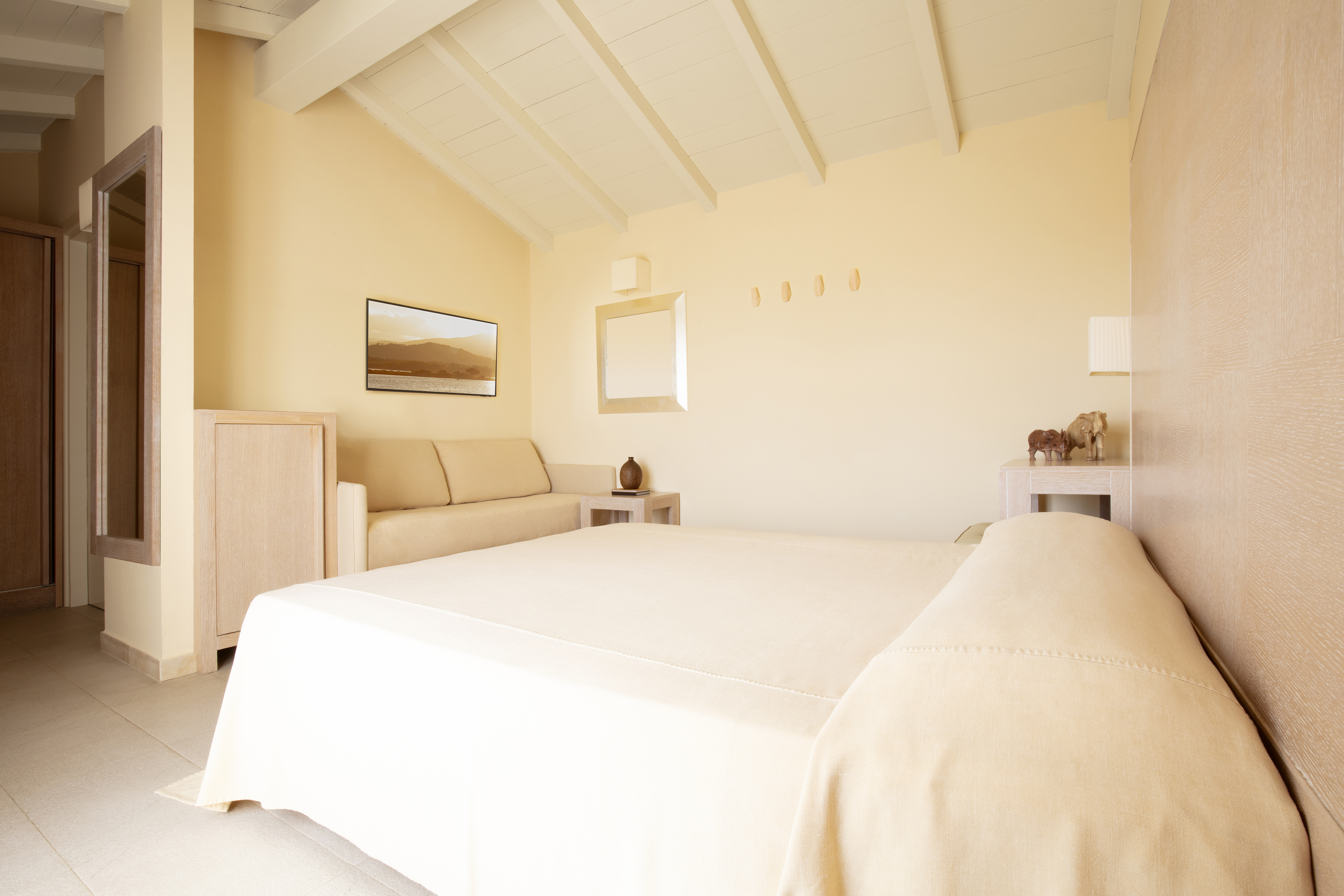 Im Resort erwarten Sie 100 Zimmer mit privater Terrasse oder Innenhof, eingerichtet im eleganten minimalistischen Stil mit warmen Tönen oder im exotischen Stil mit feinem Design, angeordnet in zweistöckigen Innenhöfen (im Erdgeschoss oder im ersten Stock), alle umgeben von englischem Rasen, Palmen, Olivenbäumen und Springbrunnen.