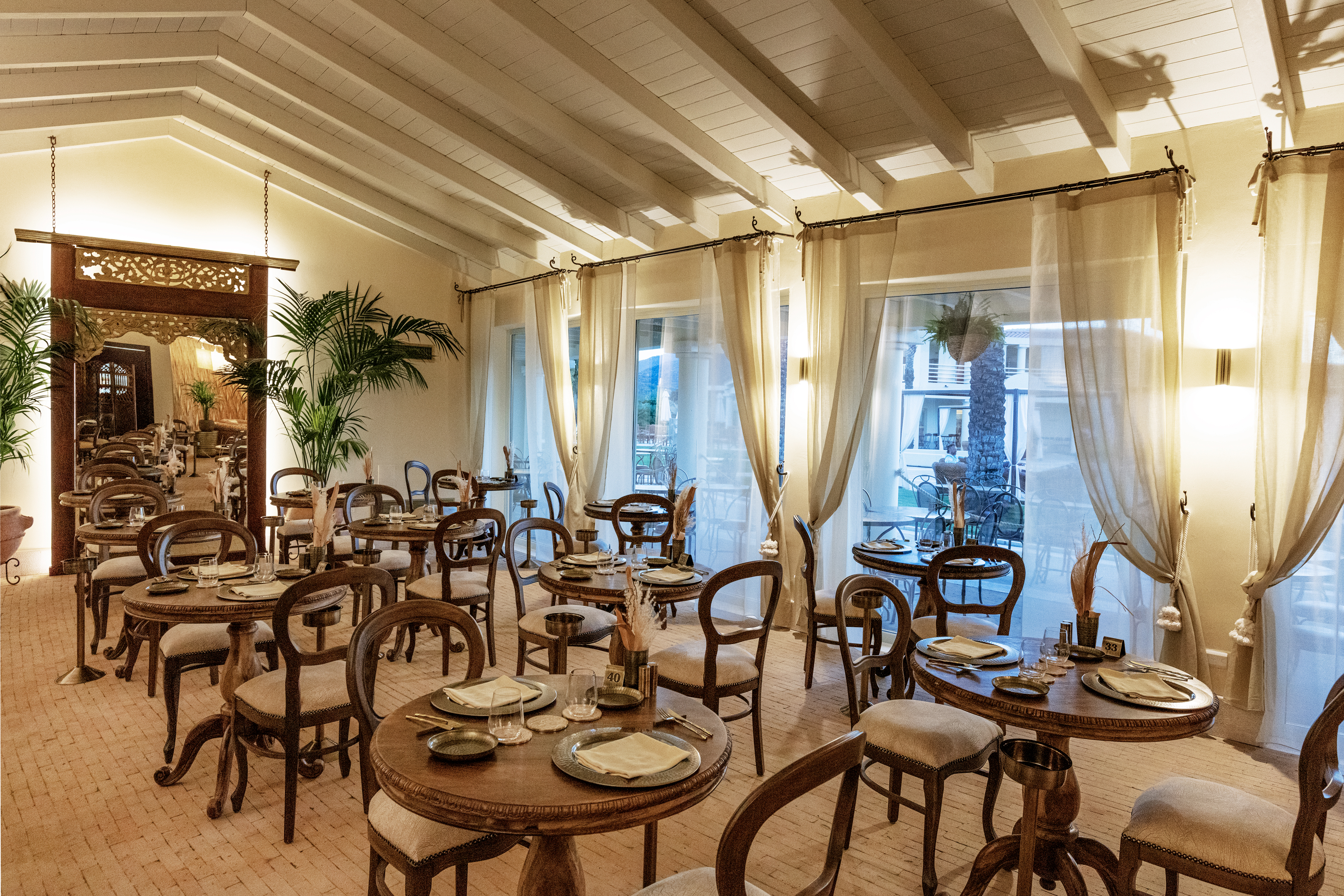 Das Frühstück, das bei allen Buchungen inbegriffen ist, wird im herrlichen, hellen Frühstücksraum mit Blick auf den Pool und das Meer serviert, der durch große Panoramafenster zu sehen ist; Für Gäste mit Halbpension wird das Abendessen im "Exoticus" serviert.